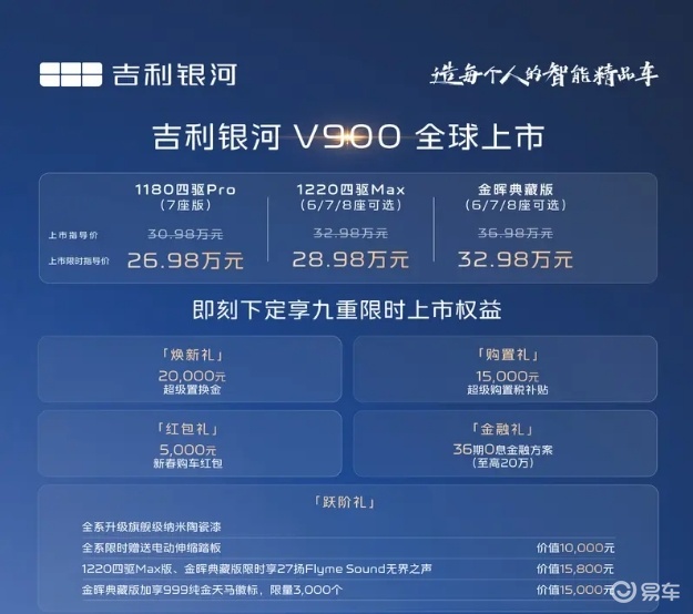先看价格。吉利银河V900共推出3款车型,官方指导价30.98-36.98万元,上市限时指导价26.98-32.98万元。限时权益包括2万元超级置换金、1.5万元购置税补贴、5000元新春红包、36期0息金融方案(至高20万)等。